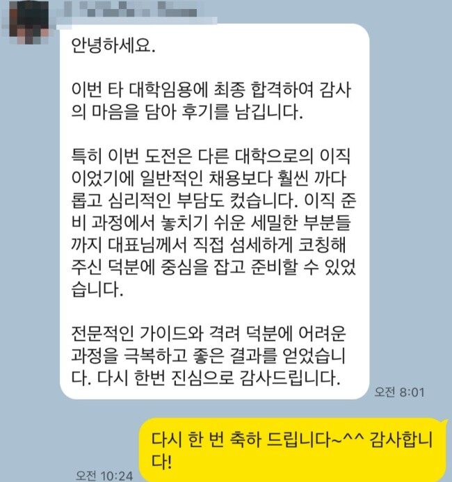 공개강의(시범강의) 준비를 중심으로 인성면접/총장면접 준비도 함께 철저히 했던 덕에 서울 소재 대학 2군데에서 최종 합격 소식을 들으실 수 있었다고 하시면서 감사 인사를 전해 주셨습니다.