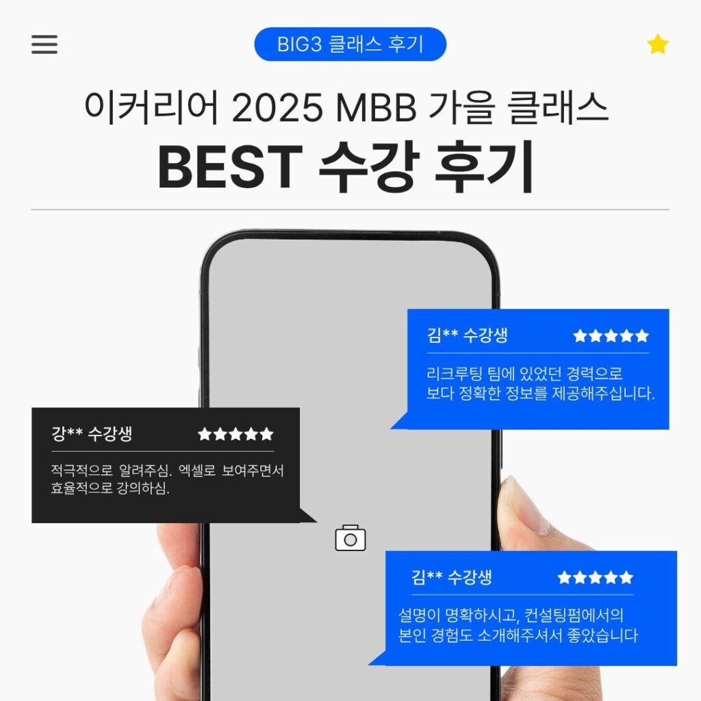 안녕하세요 😊 수강생 만족도 거의 만점! 매 시즌 뜨거운 관심을 받고 있는 이커리어 Big3(MBB) 컨설팅펌 입사 대비 클래스가 다시 돌아왔습니다. 지난 가을 클래스 역시 많은 분들의 성원과 열정 덕분에 성공적으로 마무리되었는데요, 함께해 주신 수강생 여러분께 진심으로 감사의 마음을 전합니다. 🙏 이번 후기 모음에서는 가을 CLASS 수강생분들이 어떤 부분에서 가장 큰 도움을 받았는지, […]
