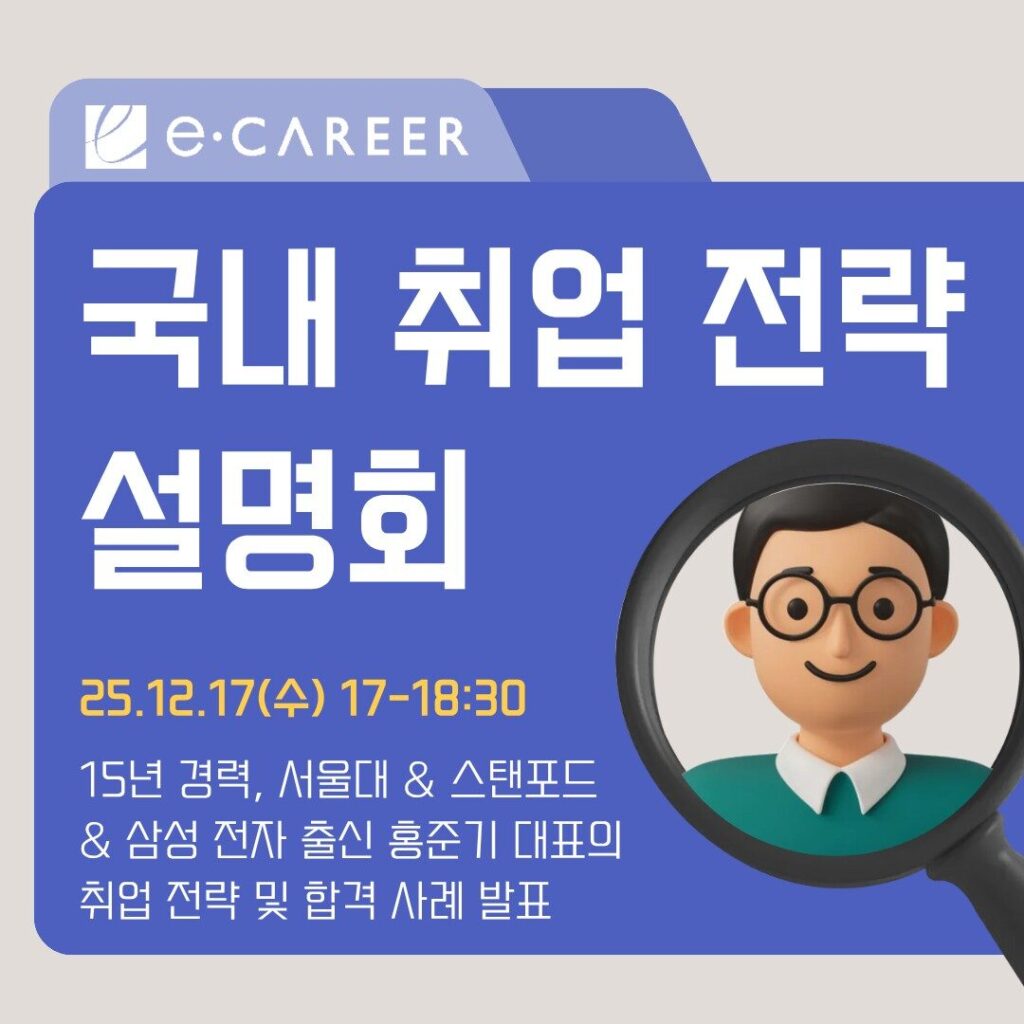 취업컨설팅 명가 이커리어에서 2025년 하반기 무료 취업 전략 설명회를 진행합니다! 2025년 하반기 취업 성공을 위해 반드시 알아야 할 채용 트렌드와 전략을 소개하는 설명회를 아래와 같이 개최하오니 많은 관심과 참여 바랍니다. <2025년 하반기 주요 분야별 국내 취업 전략 설명회> [프로그램 안내] ▶ 참가 신청 링크 : https://forms.gle/vNYjGM8atvFcKHrd8 ※ 신청자에 한해 강의 1일 전 Google Meet 링크와 […]